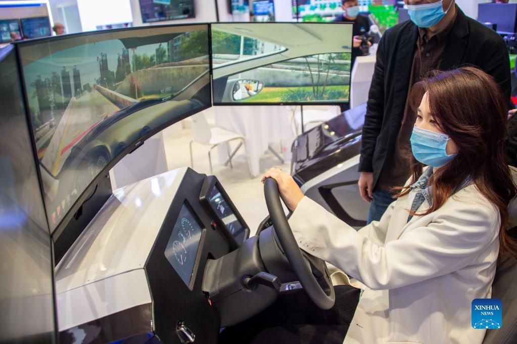 A visitor experiences a smart driving simulator at China 5G+ Industrial Internet Conference in Wuhan, central China's Hubei Province, Nov. 19, 2021. China 5G+ Industrial Internet Conference runs from Nov. 19 to 21. (Photo by Wu Zhizun/Xinhua)