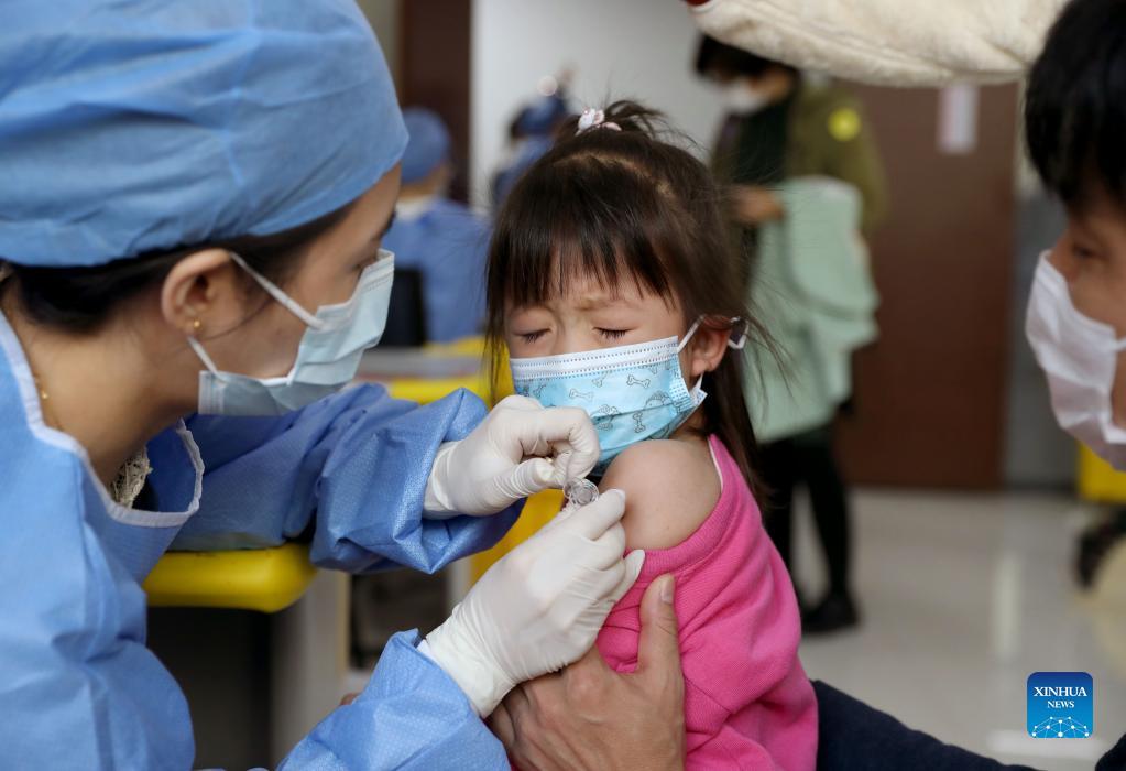 A four-year-old girl receives COVID-19 vaccine at a vaccination site in Xuhui District of Shanghai, east China, Nov. 20, 2021. Shanghai started COVID-19 vaccination for children aged 3-5 from Saturday. (Xinhua/Liu Ying)