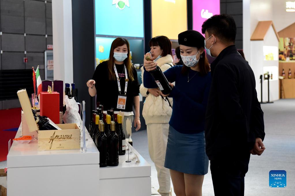 Visitors shop at the Exhibition of Import Commodity during the fourth World Manufacturing Convention in Hefei, capital of east China's Anhui Province, Nov. 20, 2021. The fourth World Manufacturing Convention kicked off Friday in Hefei. The four-day event, themed "innovation-driven, digitally empowered: global manufacturing industry aligned for high-quality growth," aims to promote high-quality manufacturing and deepen exchanges between China and the rest of the world. (Xinhua/Huang Bohan)