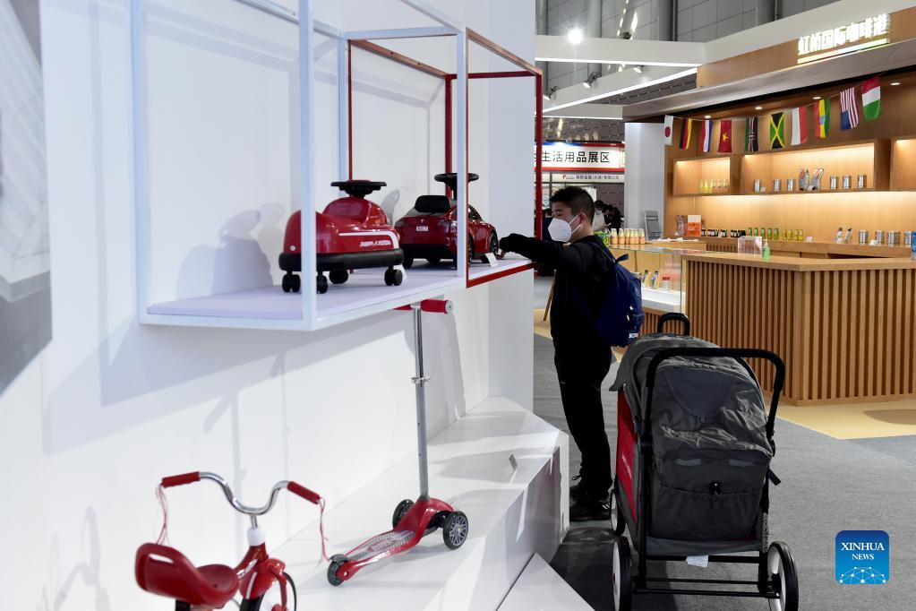A visitor shops at the Exhibition of Import Commodity during the fourth World Manufacturing Convention in Hefei, capital of east China's Anhui Province, Nov. 20, 2021. The fourth World Manufacturing Convention kicked off Friday in Hefei. The four-day event, themed "innovation-driven, digitally empowered: global manufacturing industry aligned for high-quality growth," aims to promote high-quality manufacturing and deepen exchanges between China and the rest of the world. (Xinhua/Huang Bohan)