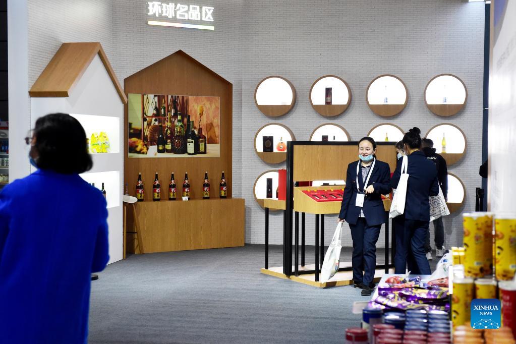 Visitors shop at the Exhibition of Import Commodity during the fourth World Manufacturing Convention in Hefei, capital of east China's Anhui Province, Nov. 20, 2021. The fourth World Manufacturing Convention kicked off Friday in Hefei. The four-day event, themed "innovation-driven, digitally empowered: global manufacturing industry aligned for high-quality growth," aims to promote high-quality manufacturing and deepen exchanges between China and the rest of the world. (Xinhua/Huang Bohan)