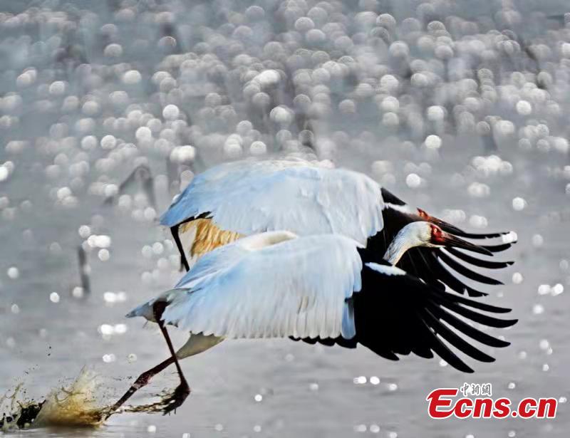 This file photo shows Siberian white cranes, which are under first-class state protection in China. (Photo: China News Service/Li Feng)