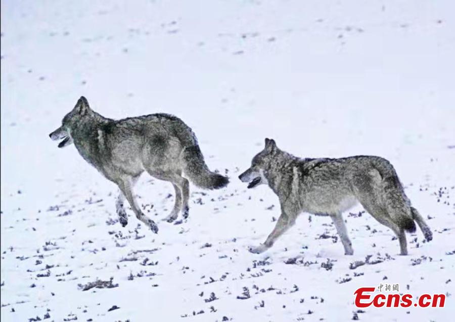 This file photo shows wolves running in the snow. (Photo: China News Service/Li Feng)