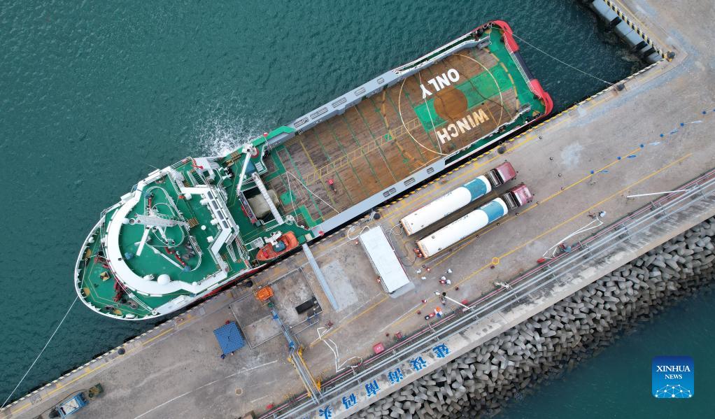 Aerial photo taken on Nov. 20, 2021 shows a berthed ship being filled with liquefied natural gas (LNG) at an LNG filling station in Macun port of Chengmai County, south China's Hainan Province. The offshore LNG filling station, built and operated by China National Offshore Oil Corporation (CNOOC) Gas &Power Group, opened for operation on Saturday in Macun port of Hainan Province. (Xinhua/Yang Guanyu)
