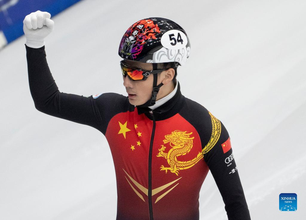Ren Ziwei of China celebrates victory after the men's 1500m final at the ISU World Cup Short Track Speed Skating series in Debrecen, Hungary, Nov. 20, 2021. (Photo by Attila Volgyi/Xinhua)