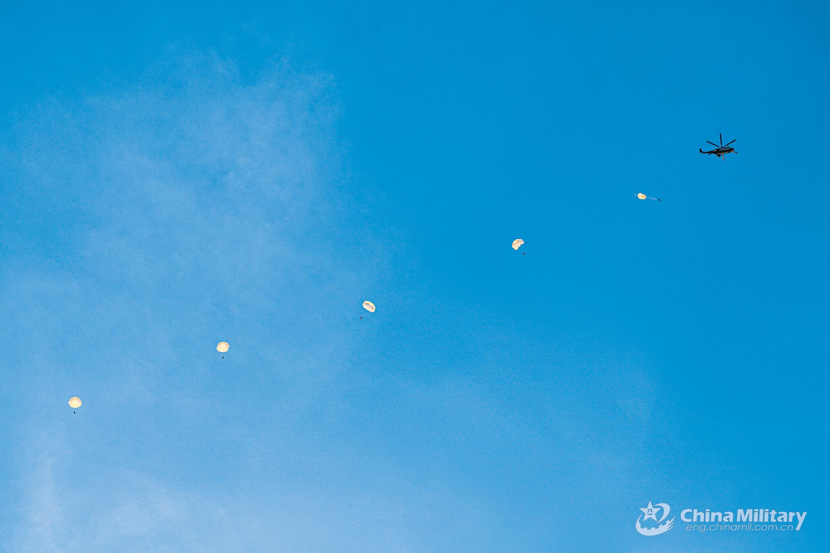 Commandos assigned to the Jiaolong Commando Unit under the PLA Navy's Marine Corps jump out of the helicopter during a parachuting training in the designated sea area in late October, 2021. (eng.chinamil.com.cn/Photo by Zhang Zhi)