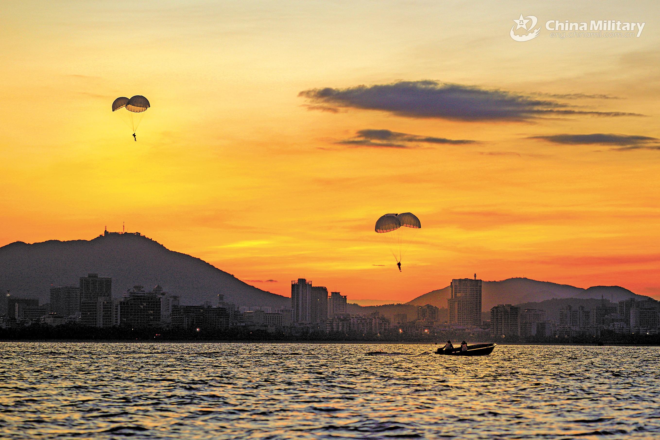 Commandos assigned to the Jiaolong Commando Unit under the PLA Navy's Marine Corps control their parachutes to reach the drop zone during a parachuting training in the designated sea area in late October, 2021. (eng.chinamil.com.cn/Photo by Jin Tian)