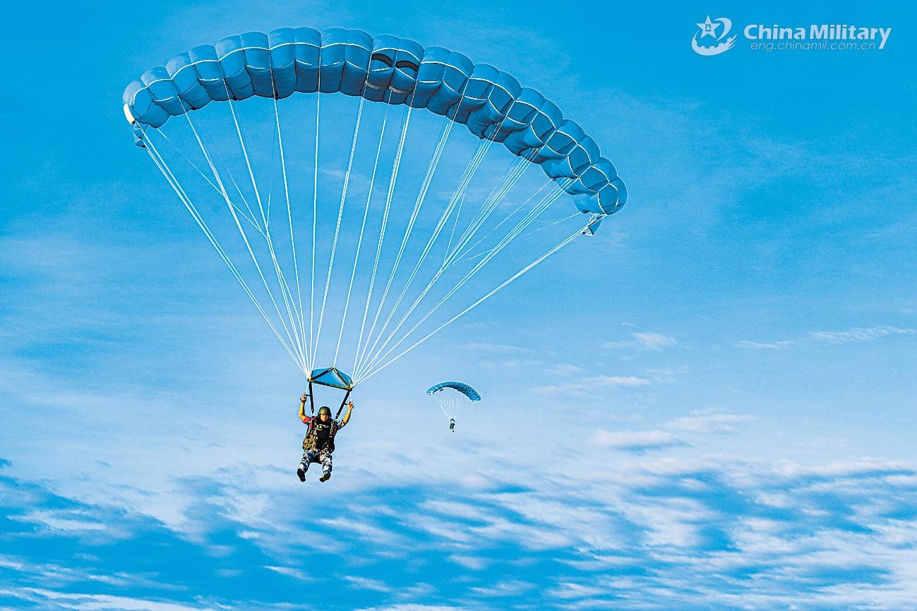 Commandos assigned to the Jiaolong Commando Unit under the PLA Navy's Marine Corps control their parachutes during a parachuting training in the designated sea area in late October, 2021. (eng.chinamil.com.cn/Photo by Lu Hongbo)