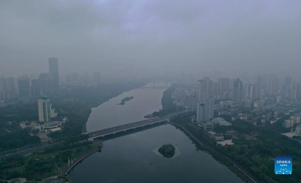 Aerial photo taken on Nov. 21, 2021 shows the Nanhu lake in rain and mist in Nanning, south China's Guangxi Zhuang Autonomous Region. (Xinhua/Huang Xiaobang)
