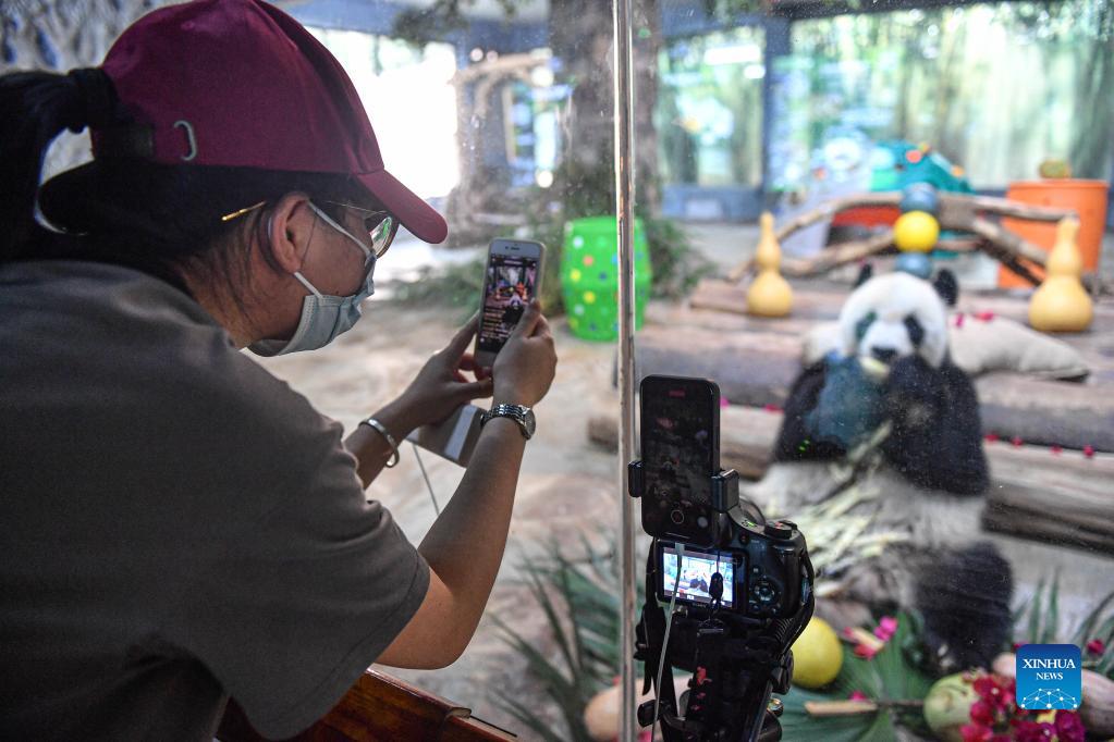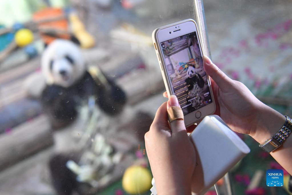 A live-streamer shoots a giant panda for a live show at Hainan Tropical Wildlife Park and Botanical Garden in Haikou, south China's Hainan Province, Nov. 21, 2021. The park on Sunday held celebrations for two giant pandas inhabiting the island province for three years. (Xinhua/Pu Xiaoxu)