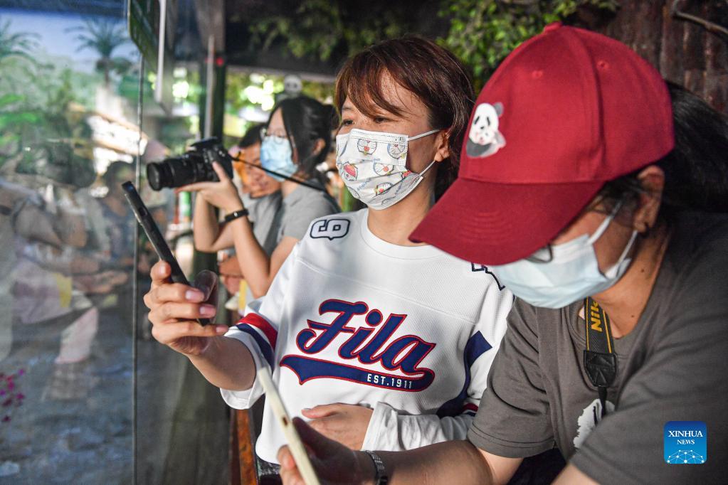 Tourists take photos of giant pandas at Hainan Tropical Wildlife Park and Botanical Garden in Haikou, south China's Hainan Province, Nov. 21, 2021. The park on Sunday held celebrations for two giant pandas inhabiting the island province for three years. (Xinhua/Pu Xiaoxu)