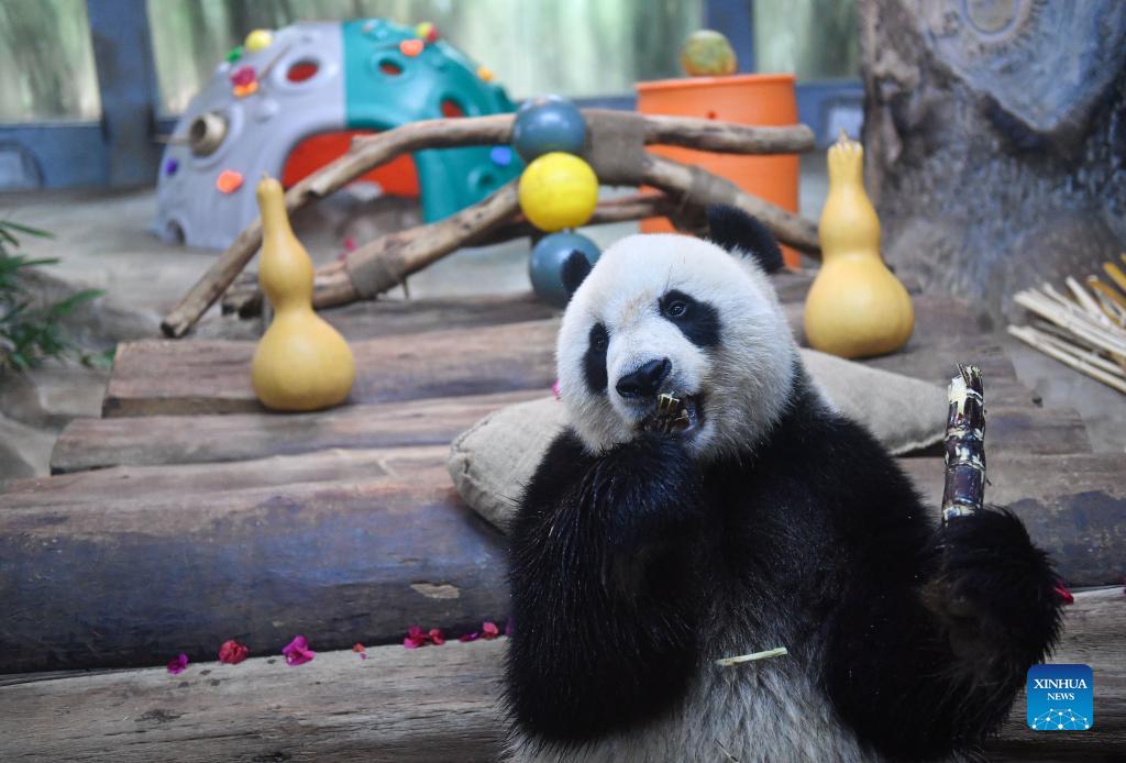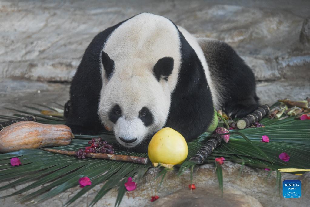 Giant panda Gonggong relishes food at Hainan Tropical Wildlife Park and Botanical Garden in Haikou, south China's Hainan Province, Nov. 21, 2021. The park on Sunday held celebrations for two giant pandas inhabiting the island province for three years. (Xinhua/Pu Xiaoxu)