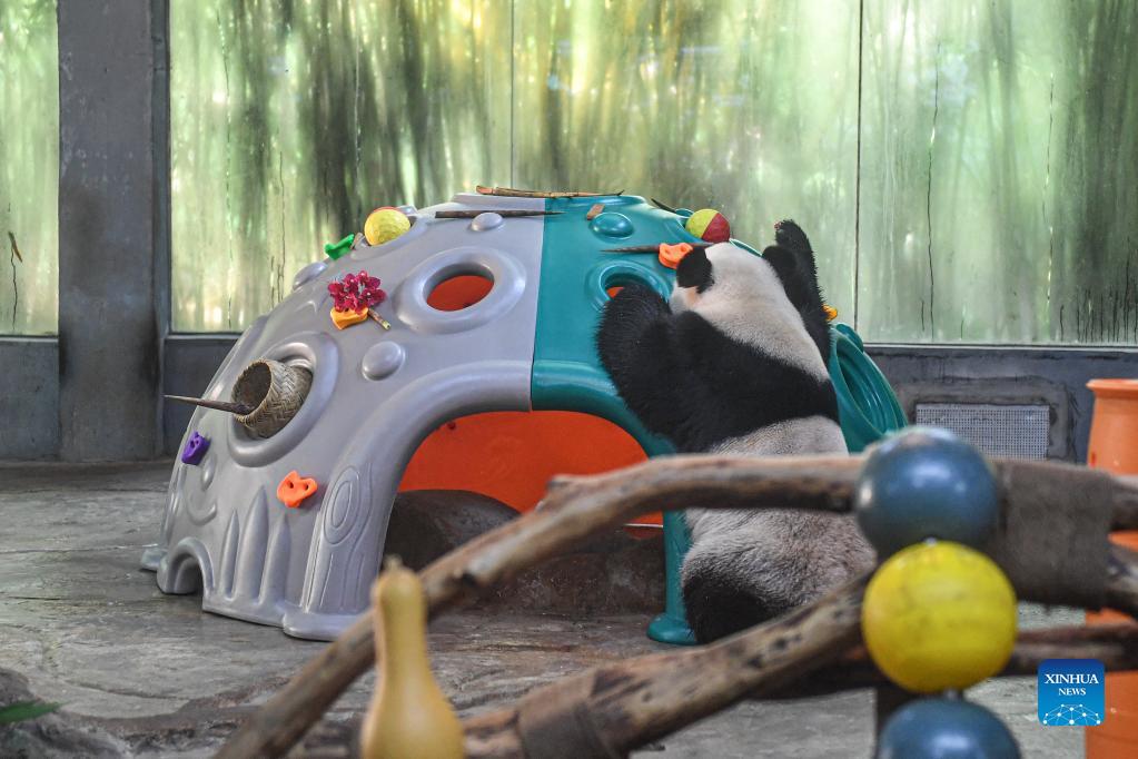 Giant panda Gonggong plays toys at Hainan Tropical Wildlife Park and Botanical Garden in Haikou, south China's Hainan Province, Nov. 21, 2021. The park on Sunday held celebrations for two giant pandas inhabiting the island province for three years. (Xinhua/Pu Xiaoxu)