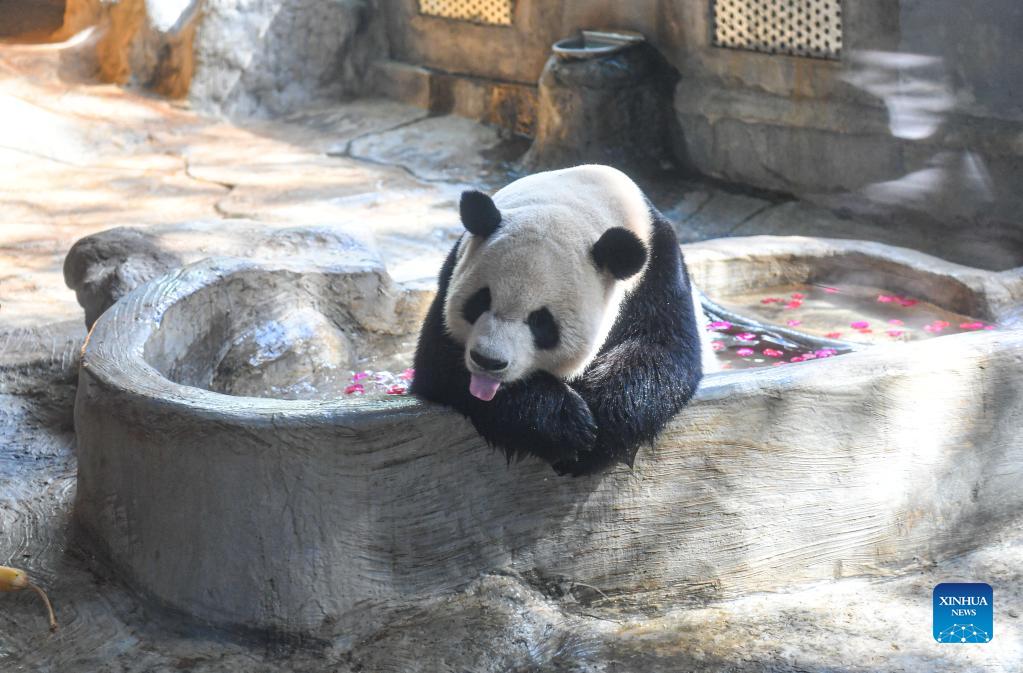 Giant panda Shunshun bathes at Hainan Tropical Wildlife Park and Botanical Garden in Haikou, south China's Hainan Province, Nov. 21, 2021. The park on Sunday held celebrations for two giant pandas inhabiting the island province for three years. (Xinhua/Pu Xiaoxu)