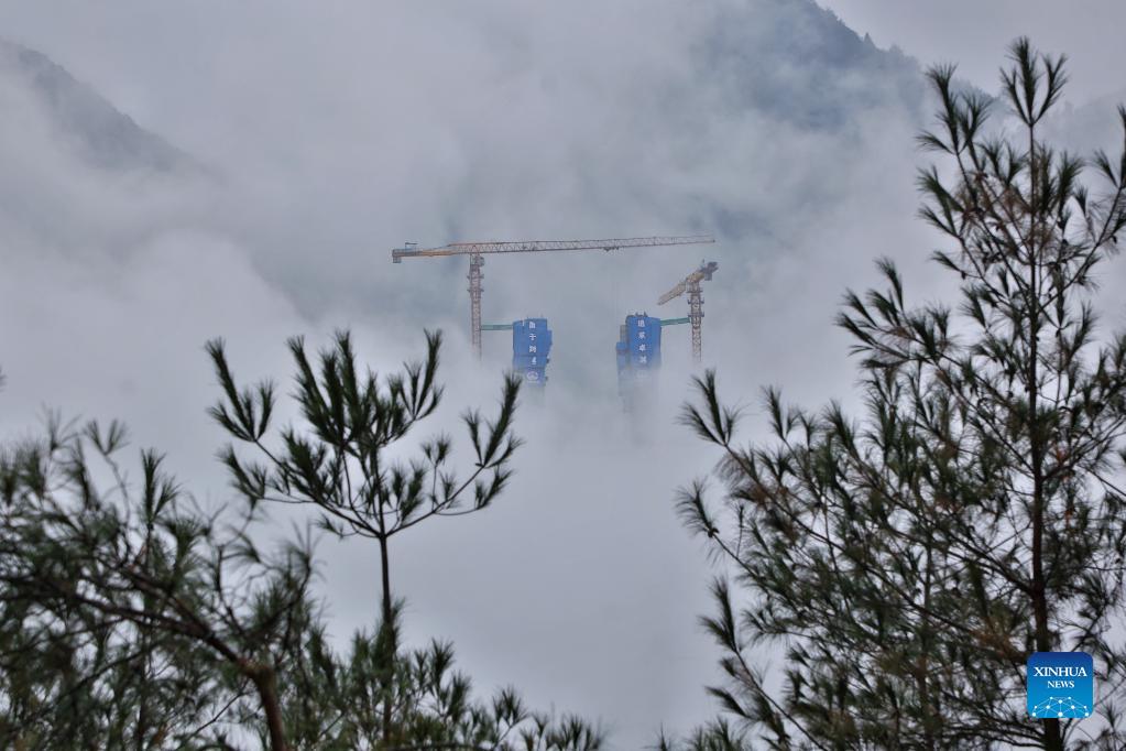 Workers pour concrete at the main tower of Tongzi River grand bridge in southwest China's Guizhou Province, Nov. 21, 2021. The main tower of the Tongzi River grand bridge was capped on Sunday. The 1,422-meter-long bridge is an important part of the Jinsha-Renhuai-Tongzi Highway. (Xinhua/Liu Xu)