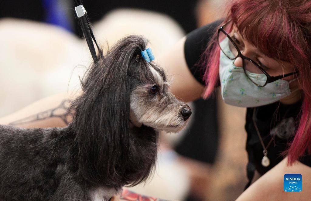 A competitor wearing a face mask grooms a dog during a grooming competition of the Toronto Christmas Pet Show in Mississauga, the Greater Toronto Area, Canada, on Nov. 21, 2021. Dozens of professional pet groomers took part in the event here on Sunday to demonstrate latest techniques. (Photo by Zou Zheng/Xinhua)