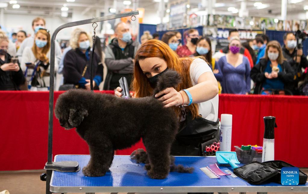 A competitor wearing a face mask grooms a dog during a grooming competition of the Toronto Christmas Pet Show in Mississauga, the Greater Toronto Area, Canada, on Nov. 21, 2021. Dozens of professional pet groomers took part in the event here on Sunday to demonstrate latest techniques. (Photo by Zou Zheng/Xinhua)