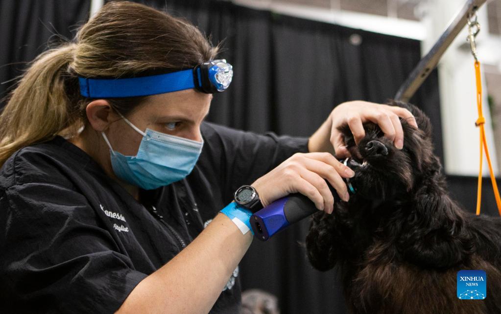 A competitor wearing a face mask grooms a dog during a grooming competition of the Toronto Christmas Pet Show in Mississauga, the Greater Toronto Area, Canada, on Nov. 21, 2021. Dozens of professional pet groomers took part in the event here on Sunday to demonstrate latest techniques. (Photo by Zou Zheng/Xinhua)