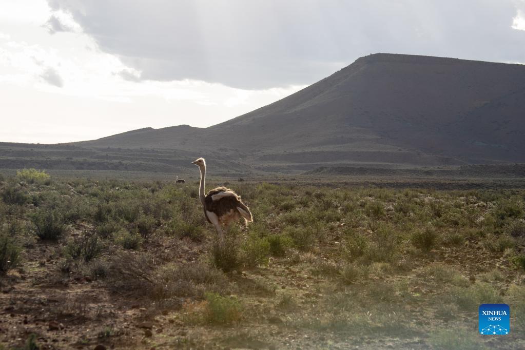Photo taken on Nov. 21, 2021 shows an ostrich in Karoo National Park, Western Cape Province, South Africa. Karoo National Park is a small portion of the Great Karoo, a vast and unforgiving landscape. Being the largest ecosystem in South Africa, the Karoo is home to a fascinating diversity of life, all having adapted to survive in these harsh conditions. (Xinhua/Lyu Tianran)