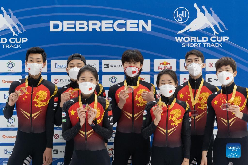 Members of Team China celebrate during the awarding ceremony after the Mixed 2000 m Relay Final during the ISU World Cup Short Track Speed Skating series in Debrecen, Hungary on Nov. 21, 2021. (Photo by Attila Volgyi/Xinhua)