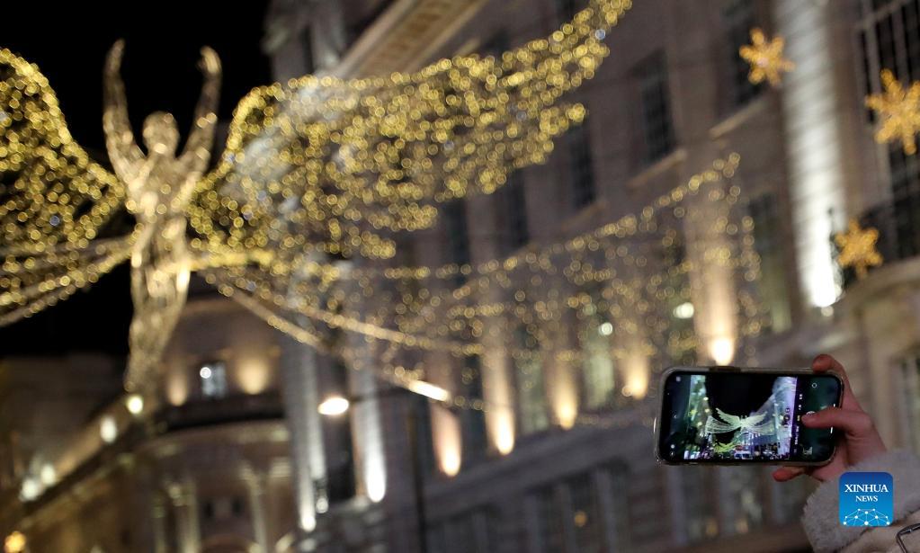 A pedestrian takes photos on Regent Street decorated with Christmas lights in central London, Britain, on Nov. 20, 2021. (Xinhua/Li Ying)