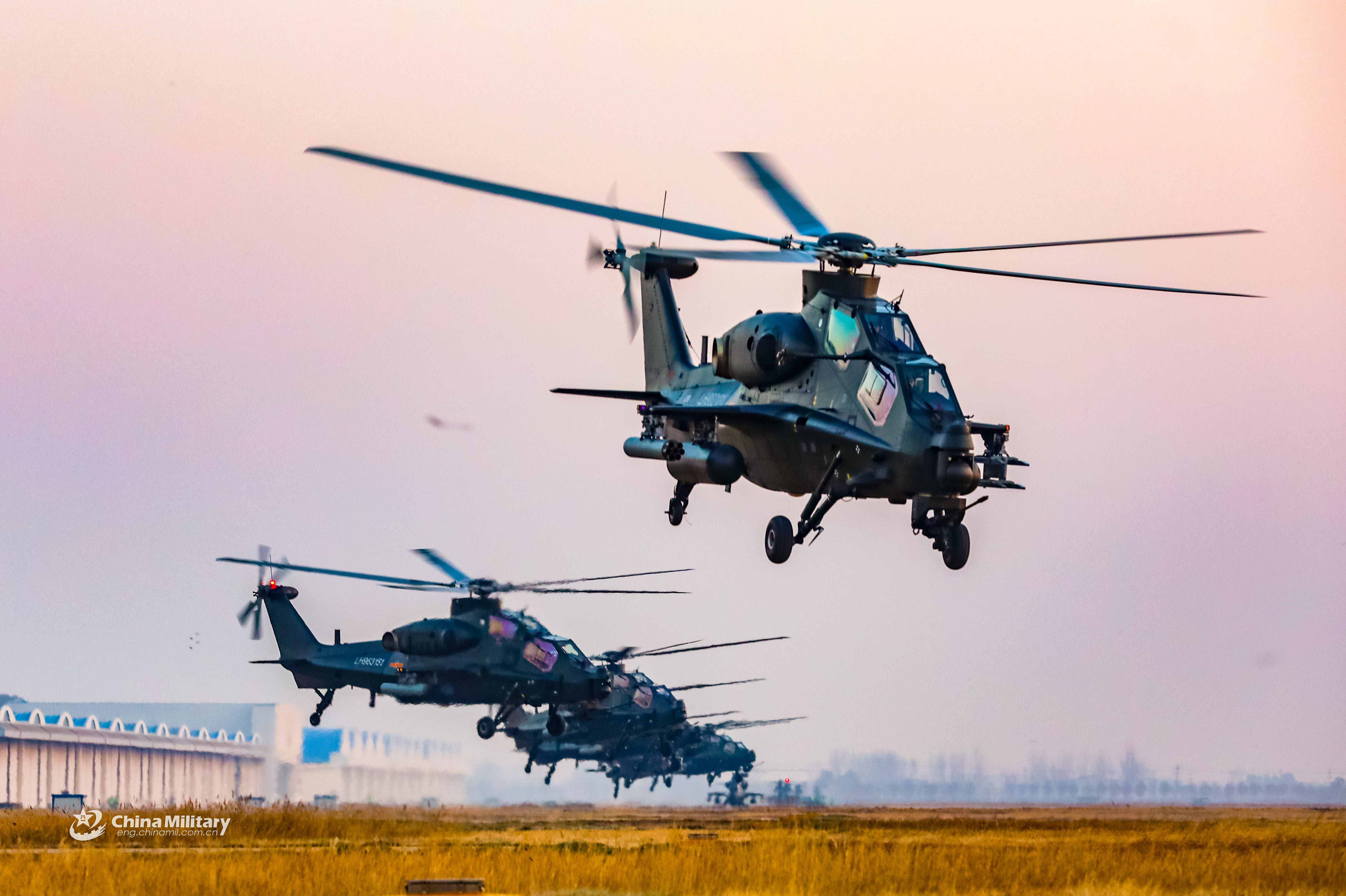 Multi-type attack helicopters attached to an army aviation brigade under the PLA 80th Group Army lift off successively for a 24-hour flight training exercise on November 14, 2021. (eng.chinamil.com.cn/Photo by Liu Yuchen)