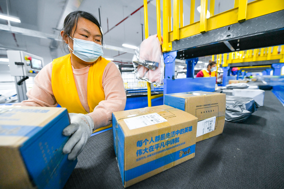 A worker sorts parcels with goods purchased during China's Singles Day shopping festival in a distribution center in Zhengzhou, Henan province, on Nov 11, 2021. [Photo/CHINA DAILY]