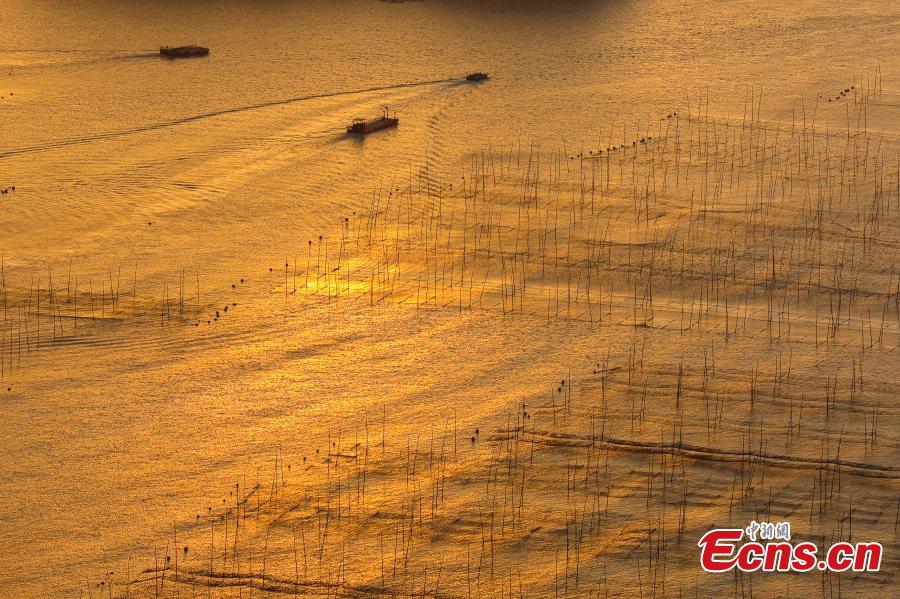 A fishing boat shuttles across a seaweed planting area and embraces the sunrise in winter days at Xiapu County, east China's Fujian Province, Nov. 20, 2021. (Photo: China News Service/Xie Guiming)