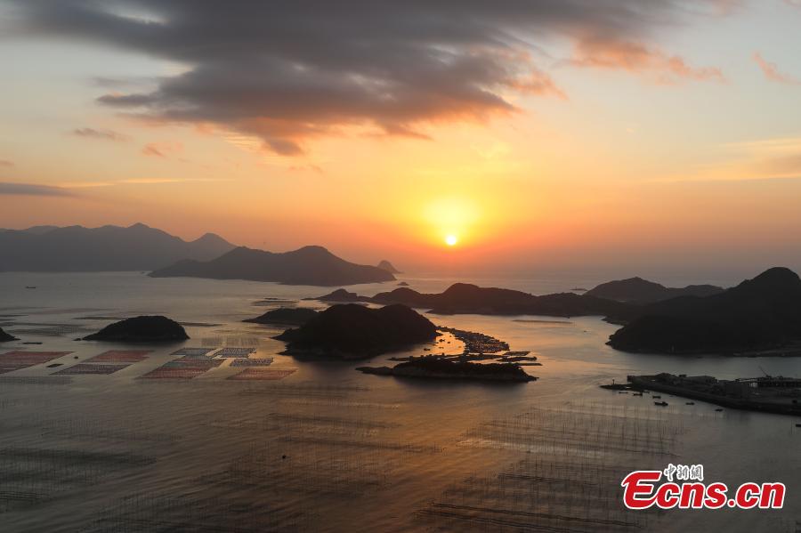 A fishing boat shuttles across a seaweed planting area and embraces the sunrise in winter days at Xiapu County, east China's Fujian Province, Nov. 20, 2021. (Photo: China News Service/Xie Guiming)