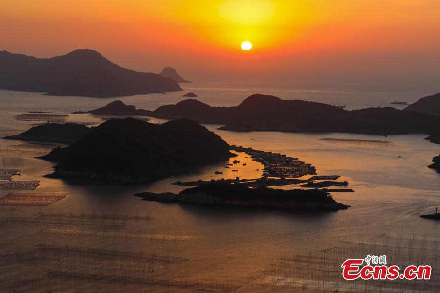 A fishing boat shuttles across a seaweed planting area and embraces the sunrise in winter days at Xiapu County, east China's Fujian Province, Nov. 20, 2021. (Photo: China News Service/Xie Guiming)