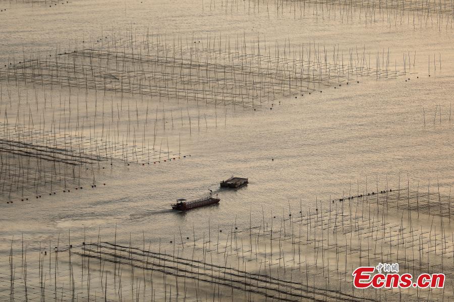 A fishing boat shuttles across a seaweed planting area and embraces the sunrise in winter days at Xiapu County, east China's Fujian Province, Nov. 20, 2021. (Photo: China News Service/Xie Guiming)