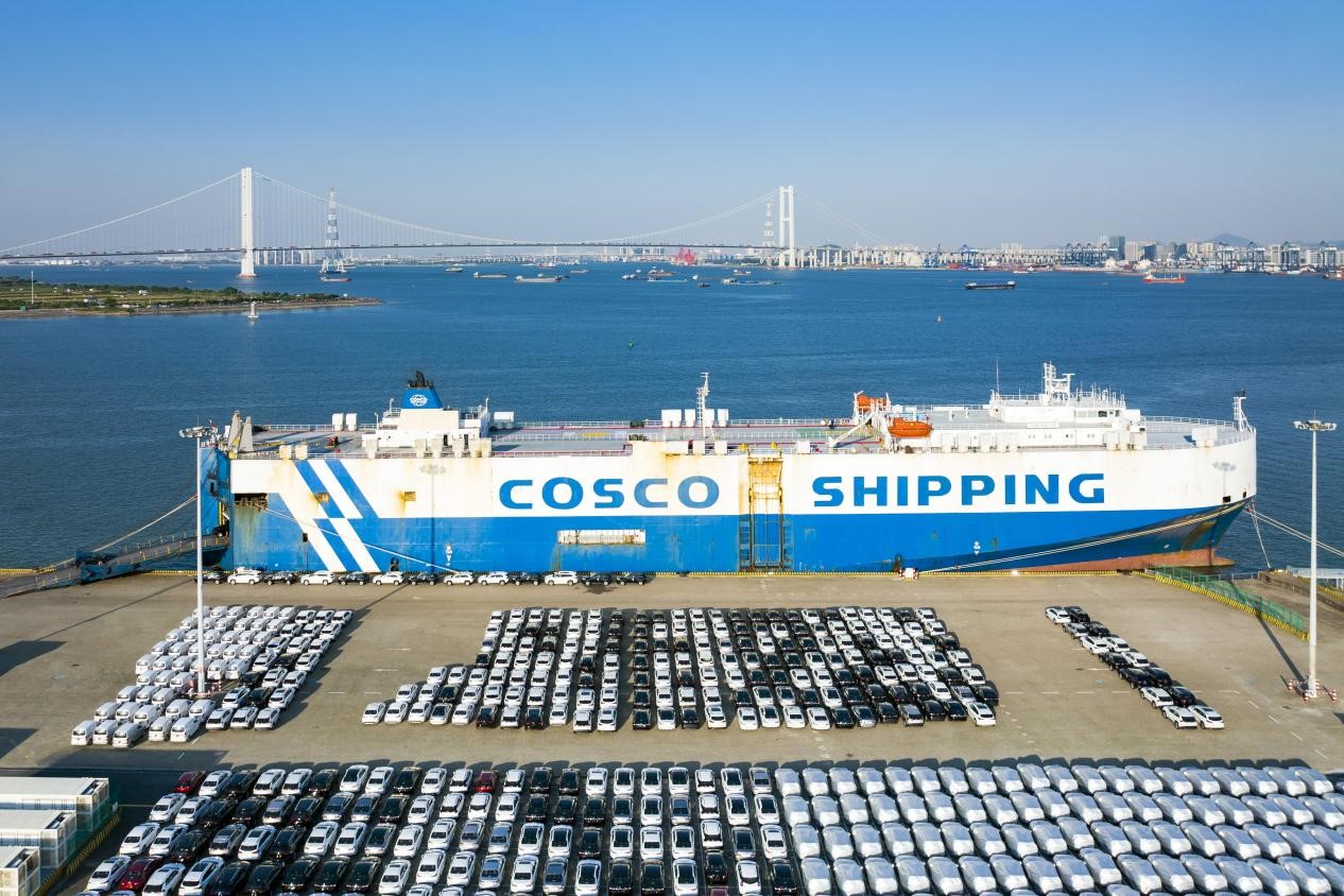 Automobiles are being loaded onto a vessel of China Ocean Shipping Company at a terminal in Guangzhou, south China's Guangdong province, Nov. 13, 2021. (People's Daily Online/Wei Jinsong)