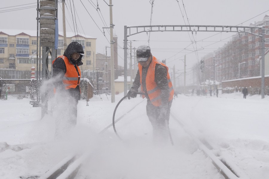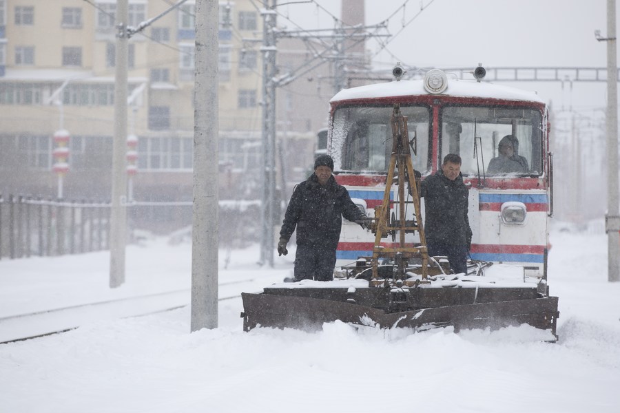 Workers of a mining company removes snow from railway tracks in Jixi City, northeast China's Heilongjiang Province, Nov. 22, 2021. (Xinhua/Zhang Tao)