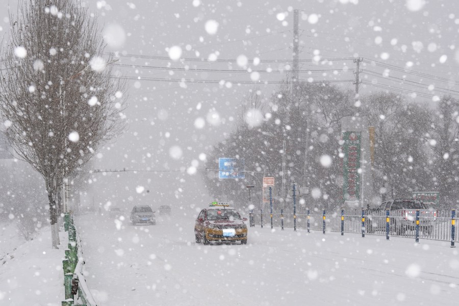 Vehicles move amid a blizzard on a street in Hegang City, northeast China's Heilongjiang Province, Nov. 22, 2021. Heavy snowfall hit many parts of Heilongjiang recently. (Xinhua/Xie Jianfei)