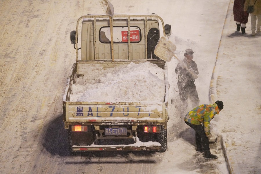 Sanitation workers clear snow from a street in Harbin City, northeast China's Heilongjiang Province, Nov. 22, 2021. (Xinhua/Wang Jianwei)
