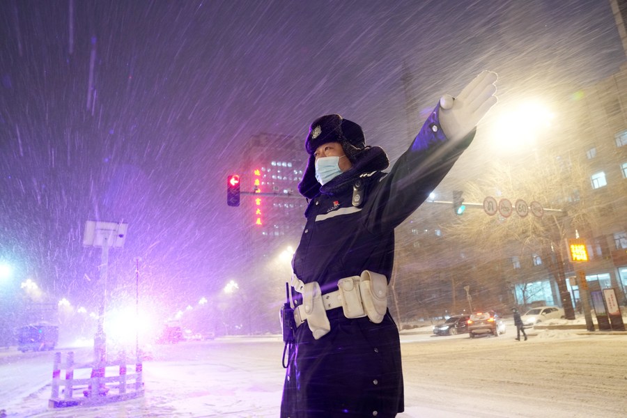 A police officer directs traffic in the snow in Harbin City, northeast China's Heilongjiang Province, Nov. 22, 2021. (Xinhua/Wang Jianwei)