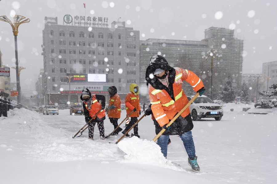 Sanitation workers clear snow from a street in Hegang City, northeast China's Heilongjiang Province, Nov. 22, 2021. (Xinhua/Xie Jianfei)