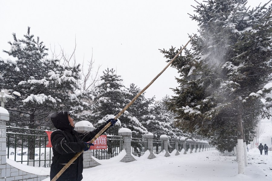 A worker removes snow from tree branches to avoid fracture in Hegang City, northeast China's Heilongjiang Province, Nov. 22, 2021. Heavy snowfall hit many parts of Heilongjiang recently. (Xinhua/Xie Jianfei)