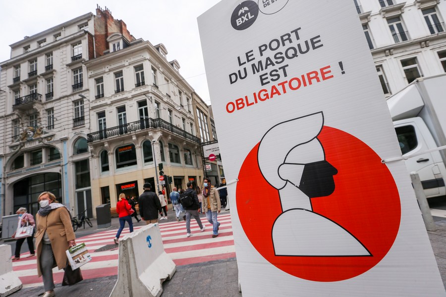 People walk on a shopping street in Brussels, Belgium, May 19, 2021. (Xinhua/Zheng Huansong)