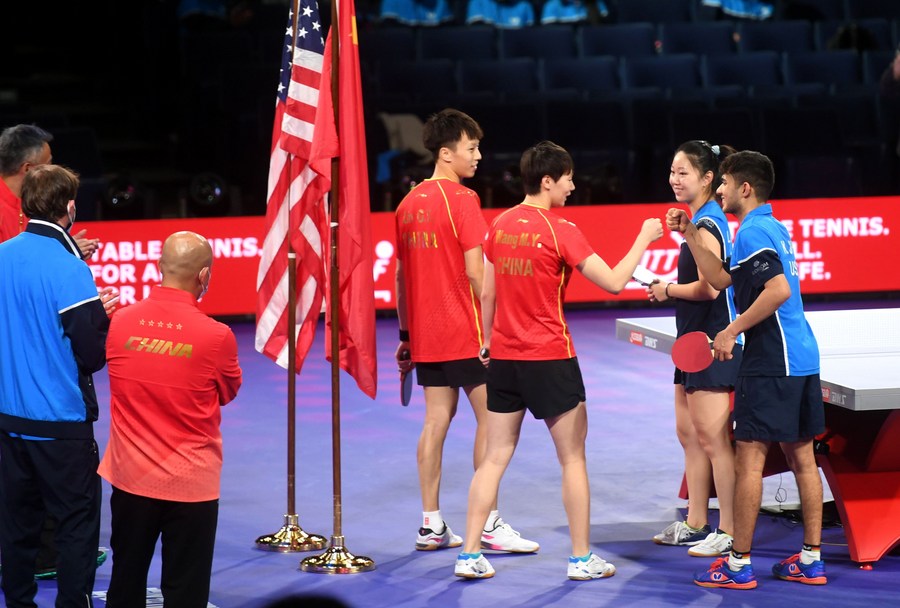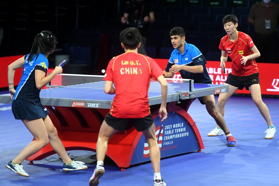 Lily Zhang (1st L) of the United States, Lin Gaoyuan (2nd L) of China compete with Kanak Jha (2nd R) of the United States and Wang Manyu of China during a joint training session of two pairs formed of both American and Chinese players entering the mixed doubles competition at the 2021 World Table Tennis Championships in Houston, the United States, on Nov. 22, 2021. (Xinhua/Wu Xiaoling)