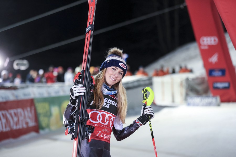 Mikaela Shiffrin of the United States poses for photos afterthe ladies' slalom race at the 2019 FIS Ski World Cup Snow Queen Trophy in Zagreb, Croatia, Jan. 5, 2019.(Xinhua/Slavko Midzor)