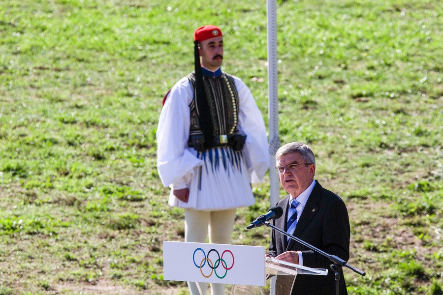 International Olympic Committee president Thomas Bach speaks at the Olympic flame lighting ceremony for Beijing 2022, in Ancient Olympia, Greece, Oct. 18, 2021. (Xinhua/Marios Lolos)
