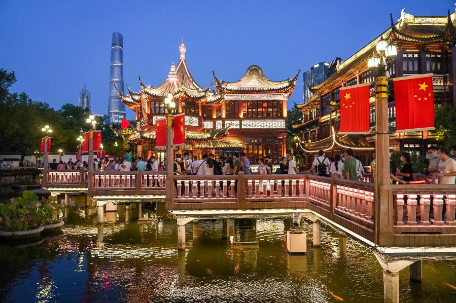 People visit the Yuyuan Garden during the week-long National Day holiday in Shanghai, east China, Oct. 2, 2021. (Xinhua/Wang Xiang)