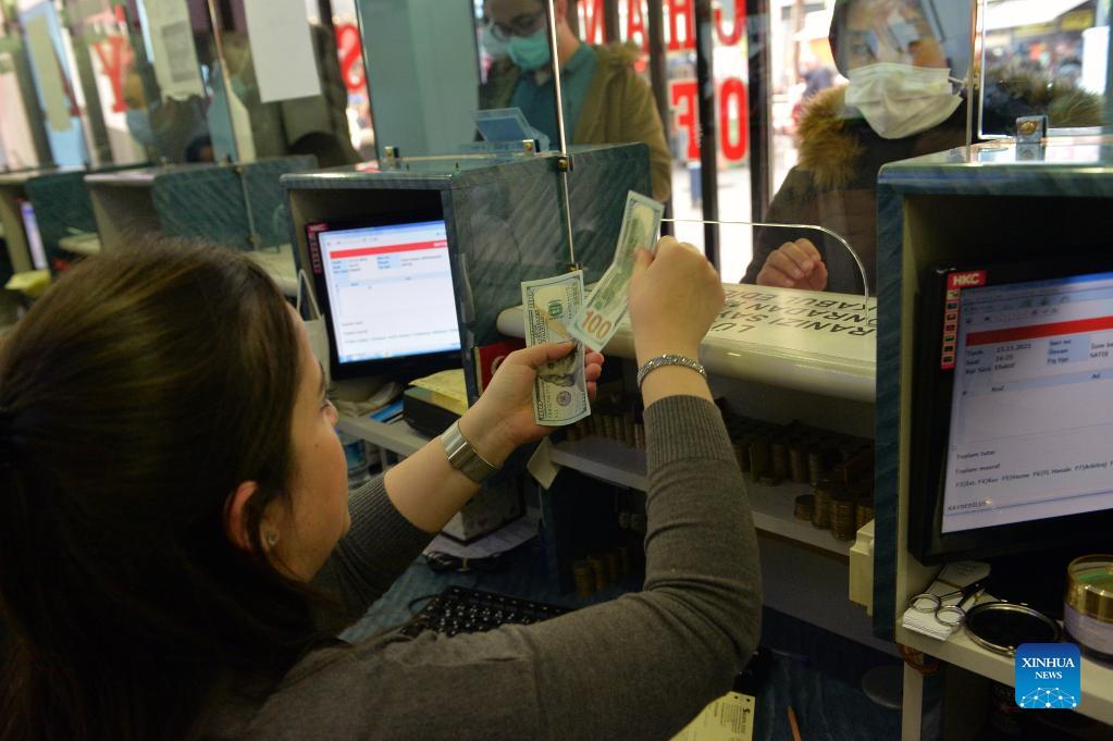 A teller counts banknotes in an exchange office in Ankara, Turkey, on Nov. 23, 2021. The Central Bank of the Republic of Turkey (CBRT) said Tuesday that it upholds its policy of implementing a floating exchange rate and has no commitment to "any exchange rate level" as the lira, the country's currency, nosedived in forex markets to a record low. The Turkish lira's exchange rate on Tuesday lost nearly 10 percent to 13.44 liras against the U.S. dollar before recovering some of its loss in late afternoon. (Photo by Mustafa Kaya/Xinhua)