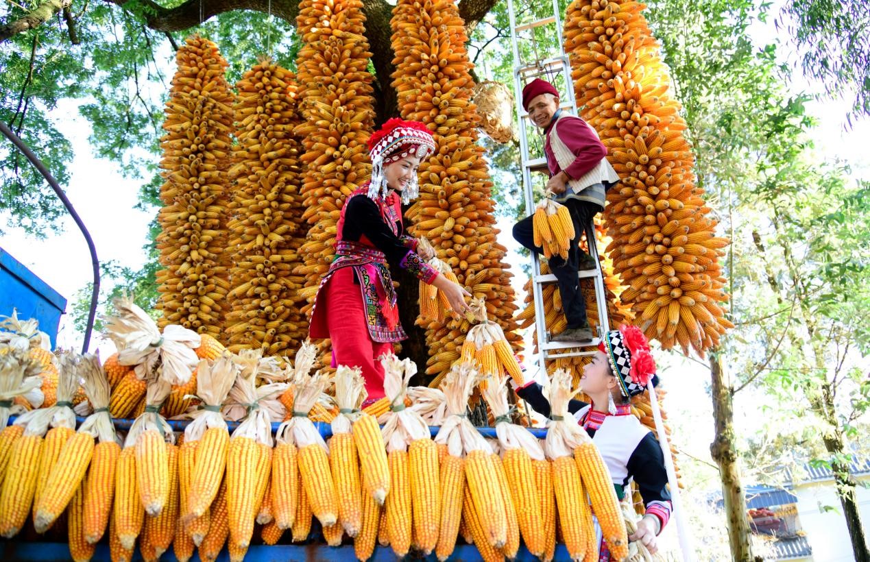 Residents of the Yi ethnic group in Xisan township, Mile, Honghe Hani and Yi autonomous prefecture, southwest China’s Yunnan province, hang corns they have harvested on a sunny day, Nov. 19, 2021. (People’s Daily Online/ Pu Jiayong)