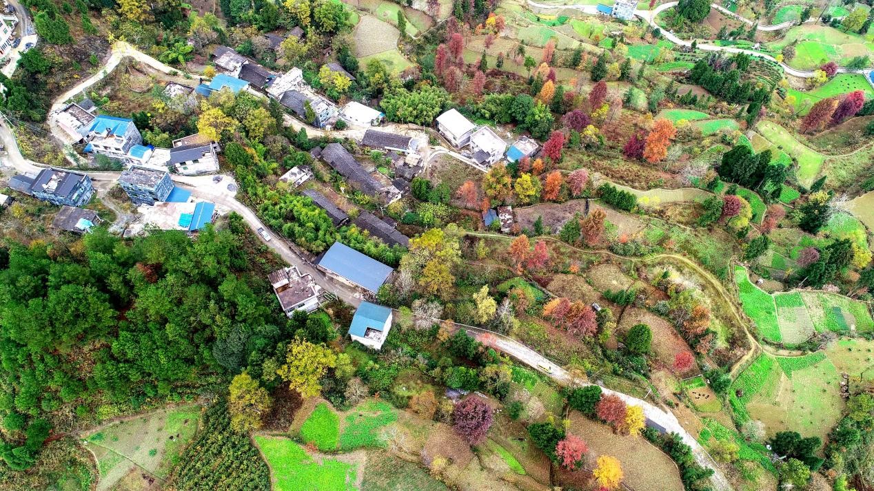 Photo taken on Nov. 22, 2021 shows country houses surrounded by maple trees in Dingshi township, Youyang Tujia and Miao autonomous county, southwest China’s Chongqing municipality. (People’s Daily Online/ He Yi)
