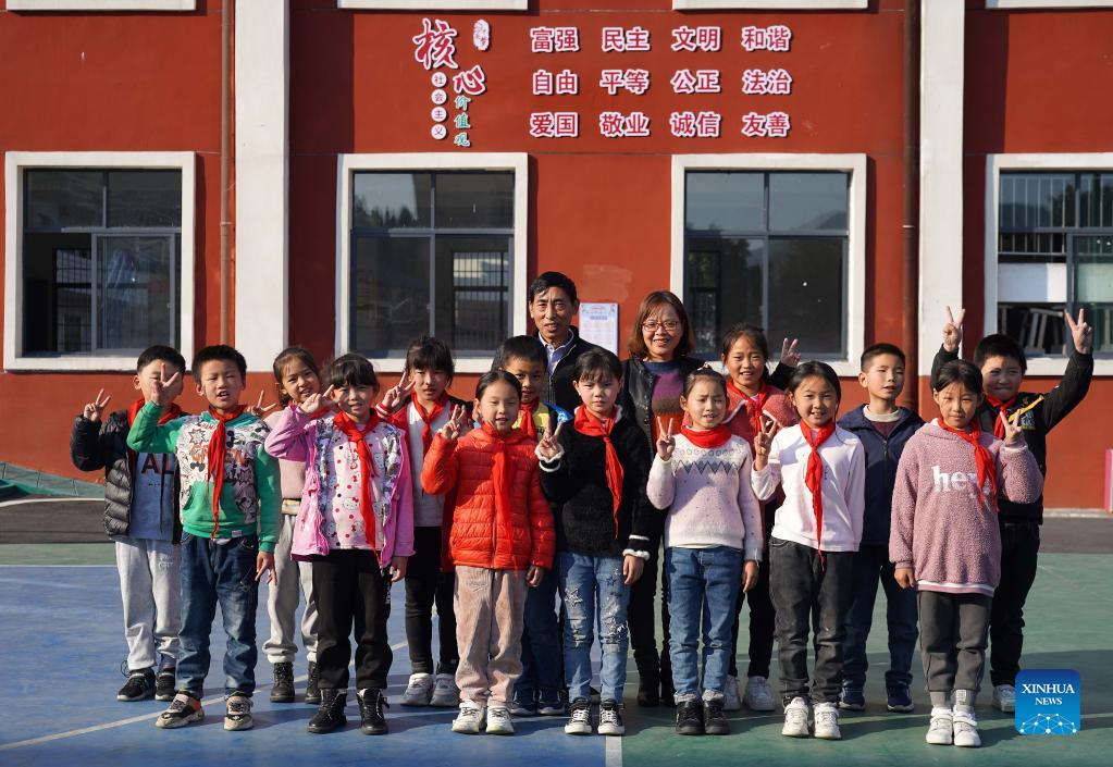 Wang Jingming (5th L, middle) and his wife Deng Jun, both teachers, pose for a group photo with students at Changfeng School in Luxi County, east China's Jiangxi Province, Nov. 18, 2021. Changfeng School sits deep in the Luoxiao Mountains. Among its 30 teachers, there are six couples. For the 170 students in the school, these couples are not only teachers teaching them knowledge but more like parents taking care of lower graders and boarding students. Wang Jingming, 46, is a chemistry teacher. In 2004, he married Deng Jun, a math teacher at the school. "We have a deep affection for the kids here and we are happy to witness their growth," said Wang. "We are willing to spend our whole lives guarding this school and protecting these kids in the mountains, hoping they can have a wonderful life." (Xinhua/Wan Xiang)