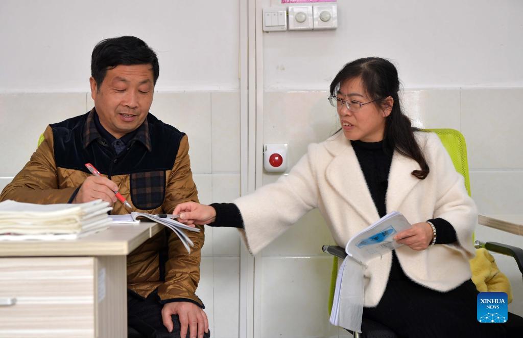 Lai Hangyun (R) and her husband Liu Zengguang, both teachers, prepare their lessons at Changfeng School in Luxi County, east China's Jiangxi Province, Nov. 18, 2021. Changfeng School sits deep in the Luoxiao Mountains. Among its 30 teachers, there are six couples. For the 170 students in the school, these couples are not only teachers teaching them knowledge but more like parents taking care of lower graders and boarding students. Wang Jingming, 46, is a chemistry teacher. In 2004, he married Deng Jun, a math teacher at the school. "We have a deep affection for the kids here and we are happy to witness their growth," said Wang. "We are willing to spend our whole lives guarding this school and protecting these kids in the mountains, hoping they can have a wonderful life." (Xinhua/Peng Zhaozhi)