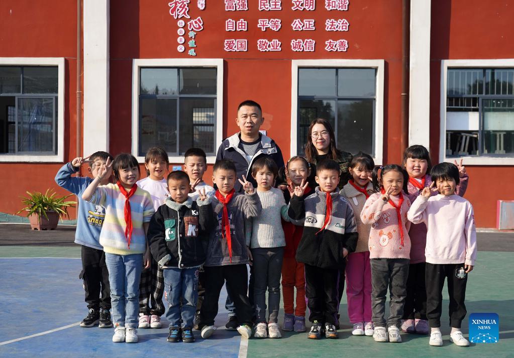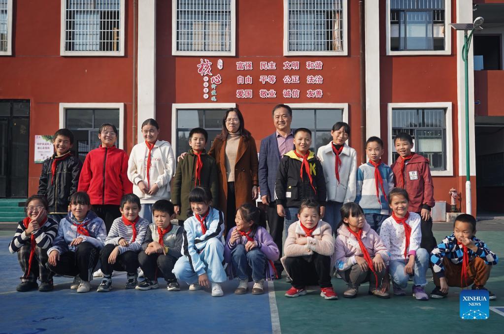 Zhu Bo (L, middle) and his wife Luo Hua, both teachers, pose for a group photo with students at Changfeng School in Luxi County, east China's Jiangxi Province, Nov. 18, 2021. Changfeng School sits deep in the Luoxiao Mountains. Among its 30 teachers, there are six couples. For the 170 students in the school, these couples are not only teachers teaching them knowledge but more like parents taking care of lower graders and boarding students. Wang Jingming, 46, is a chemistry teacher. In 2004, he married Deng Jun, a math teacher at the school. "We have a deep affection for the kids here and we are happy to witness their growth," said Wang. "We are willing to spend our whole lives guarding this school and protecting these kids in the mountains, hoping they can have a wonderful life." (Xinhua/Wan Xiang)