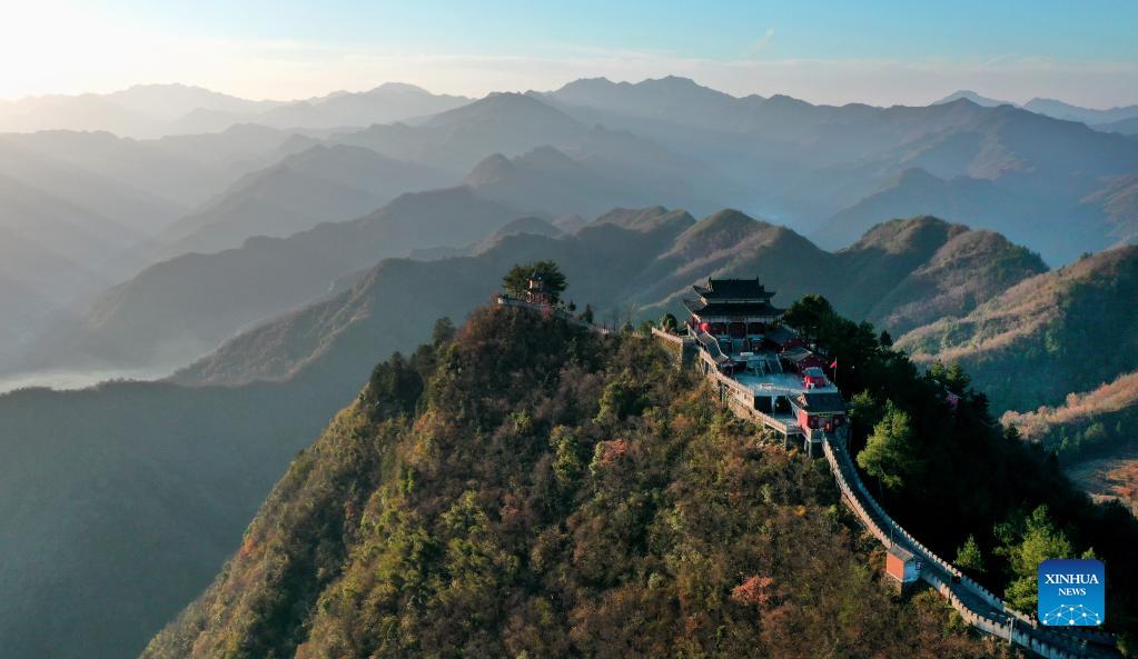Aerial photo taken Nov. 23, 2021 shows the scenery of Miaoshanzhai scenic area in Baihe County, northwest China's Shaanxi Province. (Xinhua/Tao Ming)